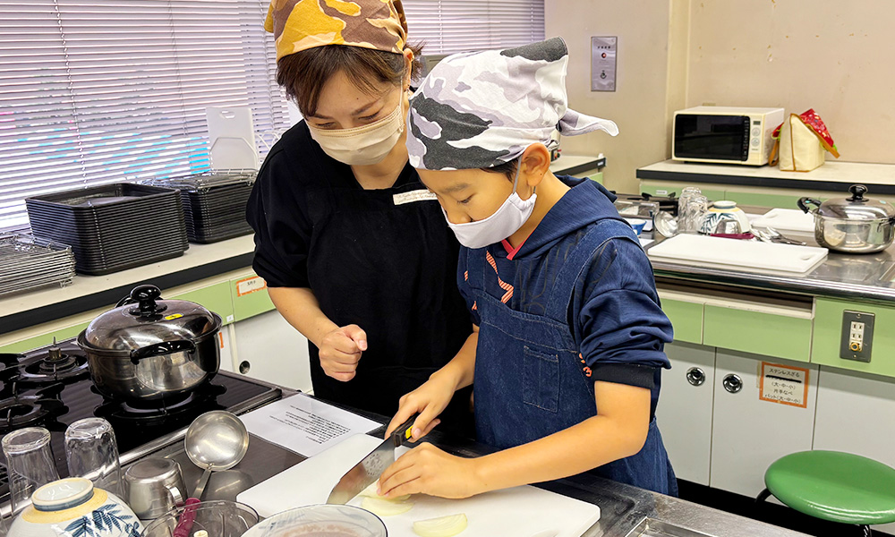 焼そばソース作りもまずは野菜のカットから。包丁をしっかりと握って、一生懸命カットしてくれました。
