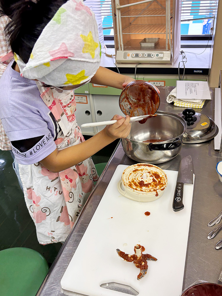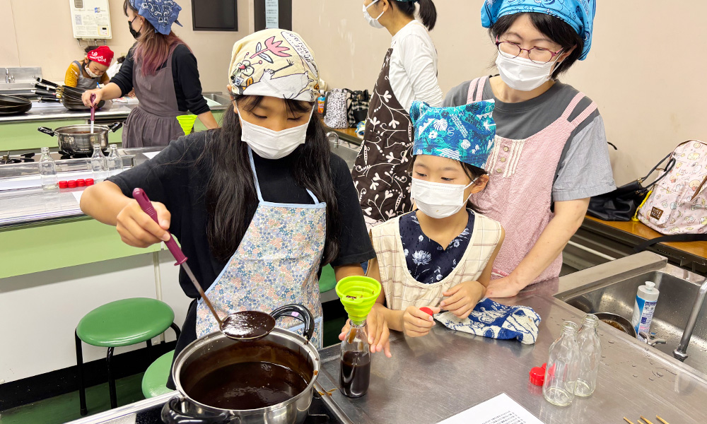 食育出前講座では、座学と合わせて、ソースやケチャップといった調味料を作る体験を実施しています。自分たちで作った調味料をお土産として持ち帰ることができ、ご家庭でも使用することが可能です。